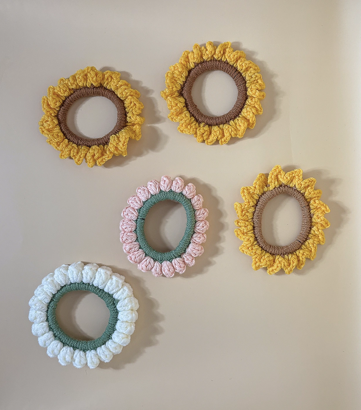 Add a touch of happiness to your hairstyles with these adorable crochet sunflower rubber bands. Each band is lovingly handmade for durability and sunshine charm.